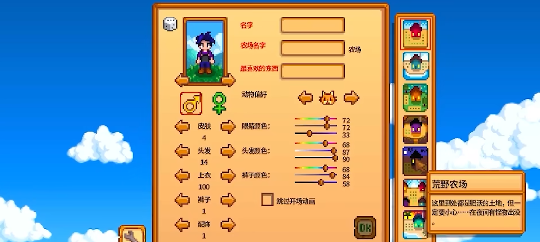 开局选择农场是决定你游戏体验的第一步,每个农场都有独特的特点和玩法侧重。标准农场适合种田爱好者,拥有最大的耕地面积,布局规整方便规划,新手可以轻松上手。森林农场每天刷新硬木和采集物,适合喜欢收集资源的玩家。河边农场水域广阔,钓鱼方便但耕地较少,适合专注钓鱼玩法的老手。山顶农场自带矿区,能挖到矿石但水源较远,适合喜欢挖矿的玩家。荒野农场夜晚会刷怪,战斗爱好者可以尝试。四角农场融合了多种特色区域,适合多人联机分工合作。海滩农场风景优美,适合休闲玩家但无法使用洒水器。