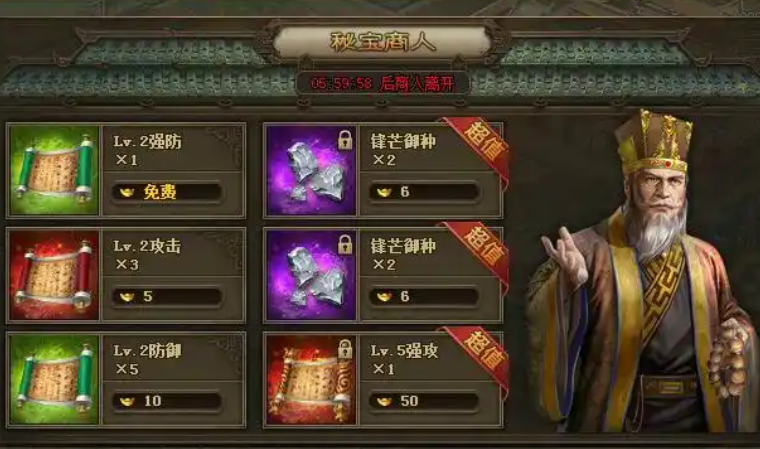 秘宝商人的交易界面分为左右两部分:左侧为常规兑换区,提供随机兵书等基础资源;右侧为充值专属区,包含紫宝引子碎片等高级道具。紫宝引子碎片分为刃车御种和锋芒御种两类,兑换需消耗金币且类型随机。右侧兑换权限需通过充值激活,但充值金额不限,且激活后30天内可重复兑换。每次商人刷新后,道具库存和类型可能变化,建议优先兑换稀缺资源。