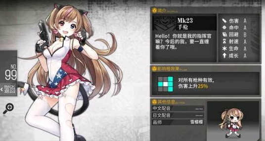 从属性面板分析,MK23的生命与伤害成长评级均为A,满级后可达29点伤害与53点命中,射速63在同类手枪中表现中等。回避能力稍弱,仅66点需注意站位保护。技能火力号令N在夜战场景优势显著,8秒持续时间的35%火力提升能有效增强队伍输出效率。但需注意该技能需手动触发,对指挥官的操作时机有一定要求。