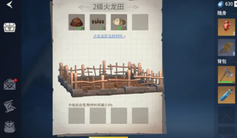 火龙田是咱们获取植物资源的重要途径,可以种植棉花、亚麻、鼠尾草、艾草、南瓜、小麦、豌豆、土豆等多种作物。这些植物后期用途广泛,比如棉花和亚麻能制作布料,艾草和鼠尾草能制作回血药,南瓜和小麦则是料理食材。建议前期至少建造四块火龙田,优先种植需求量大的作物,避免后期资源短缺。
