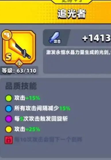 合成金色追光者后还能继续升级,金1阶段需要任意金色装备作为材料,之后每次升级都要消耗同类金色装备。虽然过程比较漫长,但每次提升都会显著增强武器属性。建议在合成金色追光者之前,先把它的技能搭配规划好,因为金色品质会解锁额外效果,配合合适的技能才能发挥最大威力。