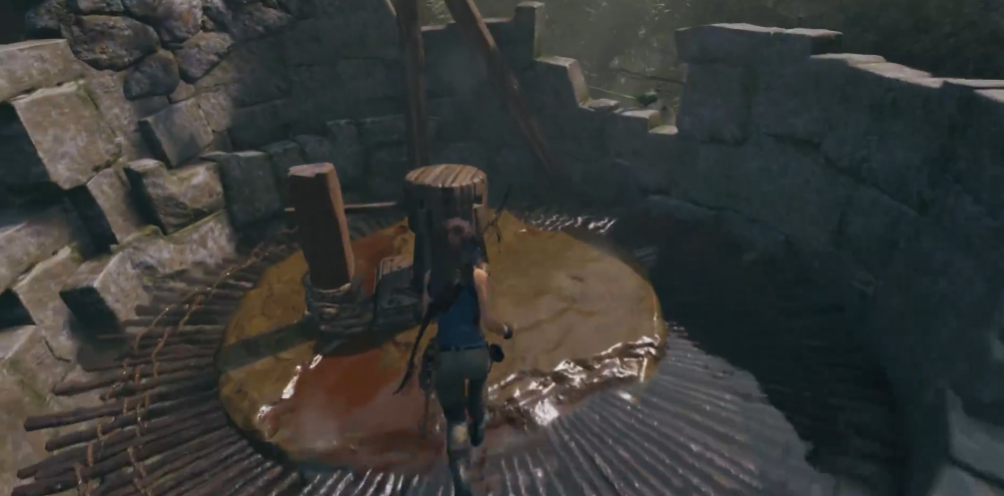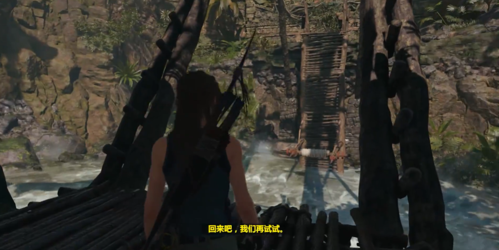 在秘鲁丛林的断桥处,咱们需要利用水利机关将木桥升起来才能通过。首先来到断桥前,根据对话提示需要爬上水塔顶部打开排气阀。沿着石轮后面的木梯爬上去,拉动开关让水塔开始工作。接着回到石轮处,和同伴一起推动机关,把水流导入绿色容器中。这时候动作要快,因为推到底后会有限时,必须立刻从右侧跳到下层,用绳索箭矢连接降下来的绳桩和对岸断桥上的绳桩。如果动作太慢,水会流出来,就得从头再来一遍。