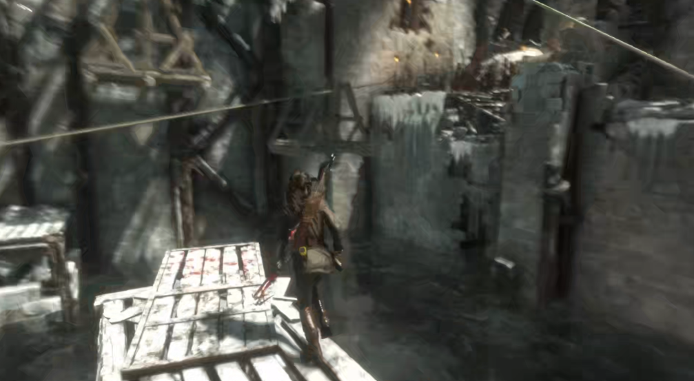 当左边矮木板靠近跳台时,立刻用弓箭固定右上角绳索,跳上去大概要5秒。在木板上等它垂直高台时跳到对面,这时候绳索大概能撑30秒,足够你跑到中间木板再跳一次。文献就在对面平台里,但千万别贪心耽误时间,木板一松可就前功尽弃啦。
