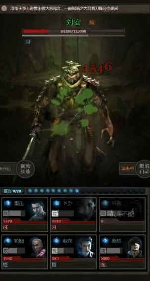 战斗分为五个阶段处理,前两波小怪通过普攻积攒能量豆,第三波小怪需用龙小哥的斩指技能快速击杀以防其降低防御;第四波小怪需保持前排4000血量以上,利用苏颜儿减伤或三王爷控制技能过渡;最终面对刘安时需确保能量豆储备充足,开场立即用龙小哥连续释放斩指技能,当BOSS血量降至30%时切换普攻收割。需特别注意折斩技能前摇动作,提前用胖子嘲讽引导攻击目标。