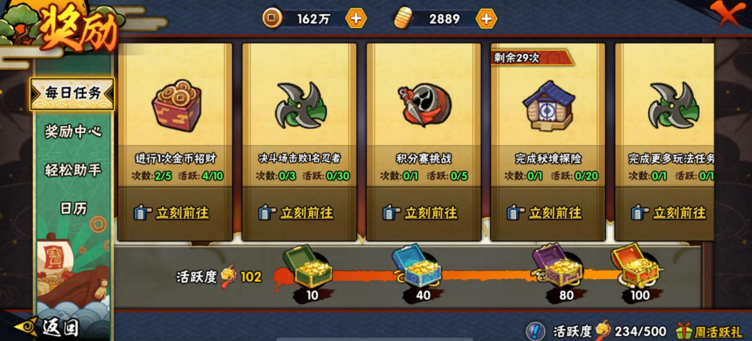 金币作为核心货币,对于招募忍者、强化装备和参与活动至关重要。想要高效积累金币,需要系统性地规划每日任务与活动参与方式。每日任务是金币积累的基础,完成活跃度宝箱可固定获得60金币,同时每日分享额外提供10金币。活跃度任务包括小队突袭、挑战副本、决斗场首胜等,这些内容耗时较短但收益稳定。建议优先完成高活跃值任务,如小队突袭三倍奖励和秘境扫荡,以最短时间达成100活跃度。决斗场每周任务同样不可忽视,保持60%以上胜率完成25场对战即可领取600金币,配合每日首胜奖励能进一步提升周收益。