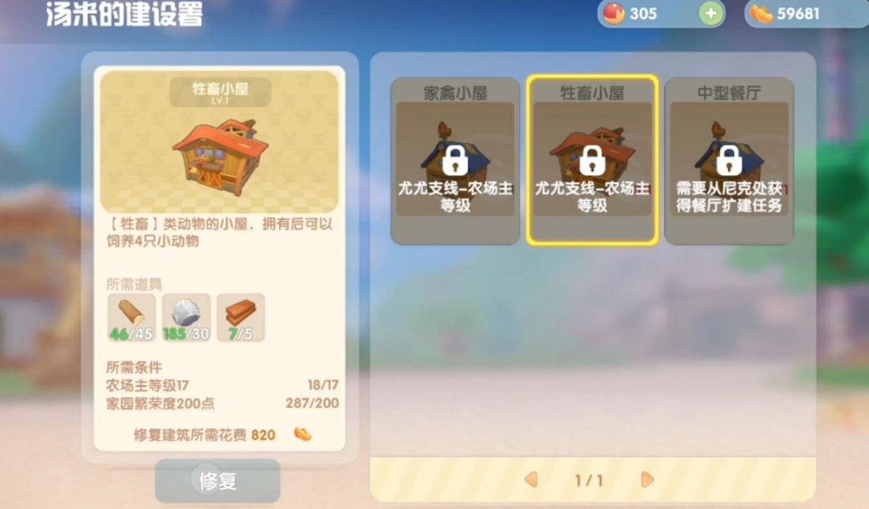 修复畜棚需要消耗640摩尔币,并等待现实时间一天完成施工。在此期间,玩家无法进行任何操作,只能等待修复完成。修复完成后,畜棚将自动解锁,玩家可以进入商店购买家禽小屋并开始饲养动物。需畜棚的修复任务需要与建筑商汤米互动,因此务必确保完成尤尤的支线任务后再前往汤米处进行后续操作。