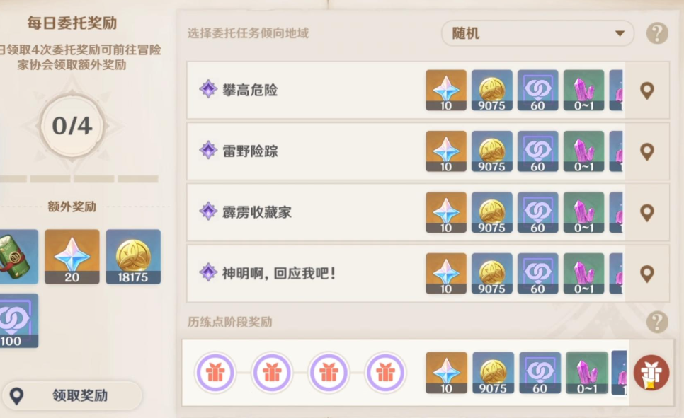每天上线后,咱们要优先完成四个每日委托任务,这些任务不仅能拿到原石和经验,还能顺便提升角色好感度。记得用你想培养好感度的角色来做委托,遇到有对话选项的任务可以先查查攻略,不同选择可能触发隐藏成就。完成委托后别忘了找凯瑟琳领取额外奖励,这可是稳定获取原石的重要途径。
