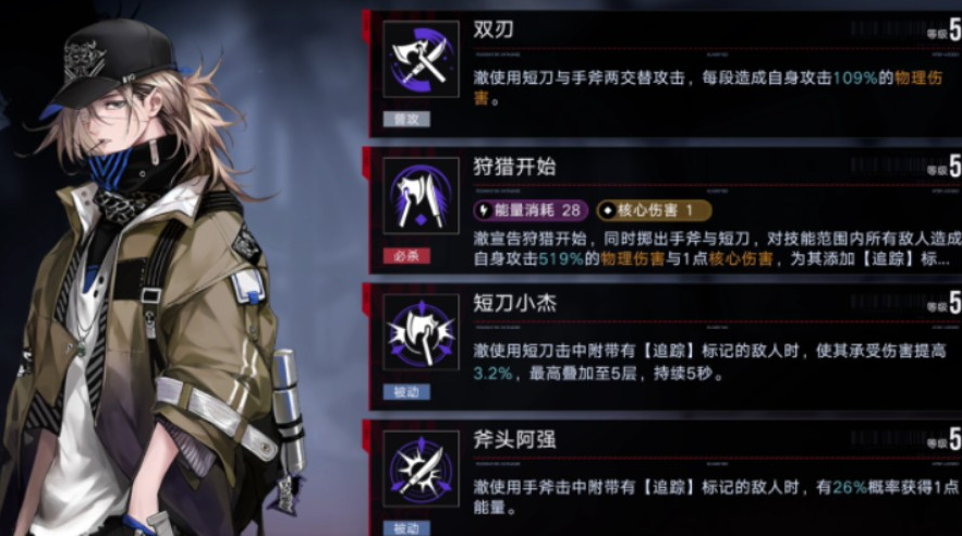 澈的技能组合设计精良,除了必杀技能的双破核效果外,还包括双刃普攻、短刀小杰被动和斧头阿强被动。普攻使用短刀和手斧交替攻击,造成物理伤害;被动技能则与追踪标记联动,短刀攻击标记敌人能叠加承受伤害提升效果,而手斧攻击有概率回复能量。这套机制让澈在战场上不仅能高效破核,还能通过增伤和能量循环增强团队输出,形成攻防一体的闭环。