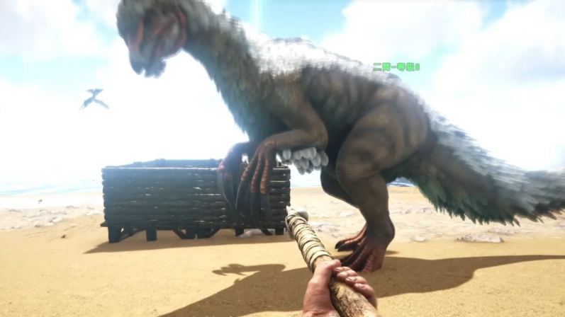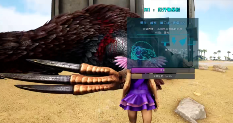当金色的驯服进度条达到100%后,你就成功驯服了这只镰刀龙。驯服后需要玩家等级达到69级才能解锁并制作它的专属鞍具,之后便可骑乘。镰刀龙是一种功能非常全面的生物,它不仅是强大的战斗伙伴,更是高效的资源采集专家。它的攻击可以采集到木材、茅草、兽皮和肉类,而使用特殊攻击则能高效地收集纤维和各类浆果。在属性加点上,可以优先考虑耐力和负重,以增强其长途运输和持续作业的能力,让它成为你在方舟世界探索与生存的得力助手。