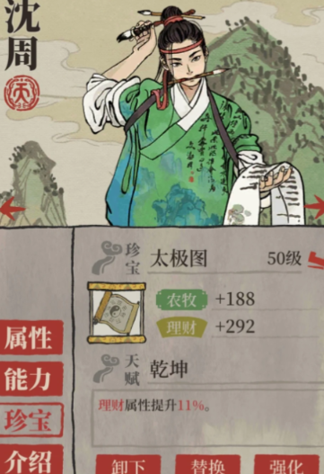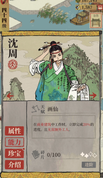 为沈周装备珍宝如太极图可以进一步增强他的理财能力,太极图提供的属性加成能额外减少工作时间,使他在书局或苏州府的效率更上一层楼。通过这种搭配,玩家可以最大化沈周的潜力,确保资源产出更加稳定和高效。在游戏前期开荒苏州府时,沈周的理财天赋能帮助快速积累铜钱等资源,减轻初期建设压力,为玩家扩展城市版图提供有力支持。他的高效工作方式让城市经济循环更顺畅,应对各种挑战时更加从容。