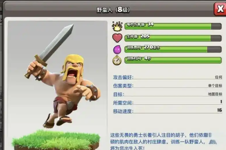 在游戏前期,野蛮人是最基础且不可或缺的战士单位。他们训练费用低廉,占据人口少,能够快速形成人海战术,无论是用于清理外围建筑,还是作为吸引火力的肉盾都非常有效。在七本发展阶段,优先升级巨人后,紧接着就会推荐升级野蛮人和弓箭手,这奠定了以地面部队为核心的推进基础。作为纯粹的近战地面单位,野蛮人虽然单体脆弱,但成规模后能造成可观的伤害,是新手阶段最可靠的战士选择。
