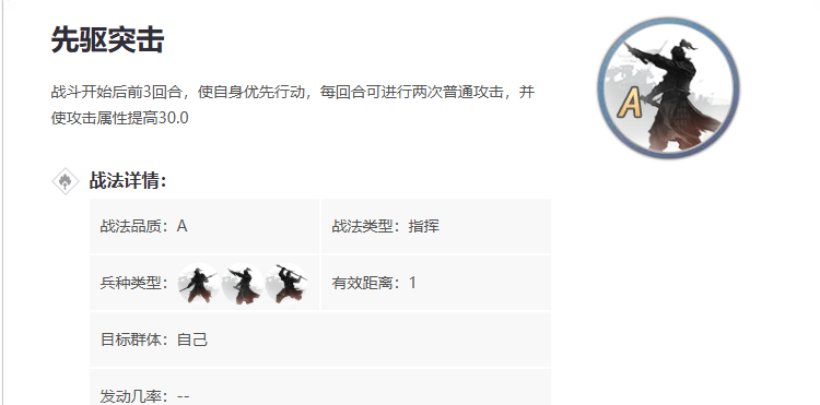 先驱突击的核心价值在于其独特的战斗机制,该战法为指挥类型,在战斗开始后的前三回合生效。其效果是使携带武将获得优先行动的权利,并每回合可以进行两次普通攻击,同时提升一定数值的攻击属性。这种先手与连击的结合,使得携带武将能在开局阶段就打出压制性的伤害,尤其适合依赖普通攻击或追击战法输出的物理型武将。该战法升级主要提升的是攻击属性加成,其最关键的先手和连击效果不受等级影响,因此一级战法就具备了核心功能,升级的性价比相对较低,在资源有限时可以优先升级其他更依赖等级的战法。