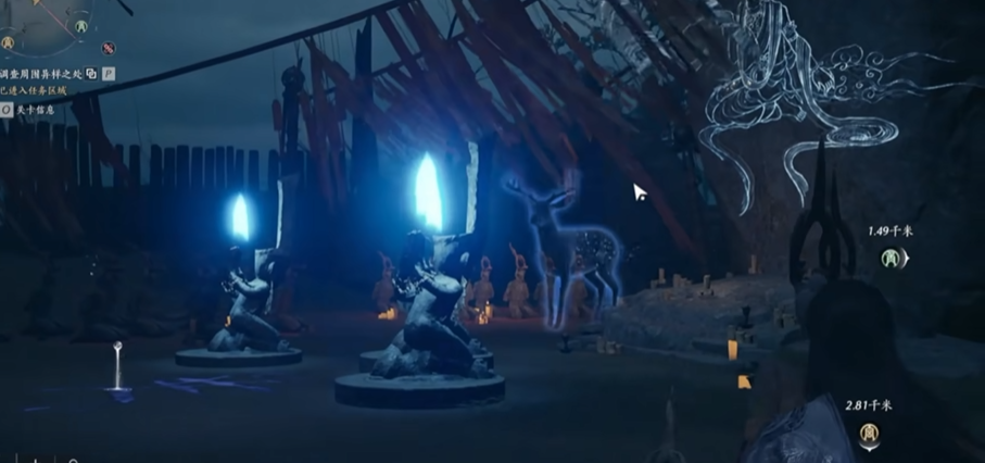 三头鹿的寻找是萤渊任务的核心环节,这个任务通常起始于荒坟村附近的神秘巨像区域。通过查看跪着的石人并在空坐垫处模仿跪拜动作,你会触发一只发光的鹿影出现,随后使用听风辩位技能来追踪鹿留下的痕迹。这些痕迹会引导你沿着右侧的小路前进,途中可能遇到倒在石门旁的NPC,获取他们的遗言后继续探索,为后续安抚三头鹿做好准备。