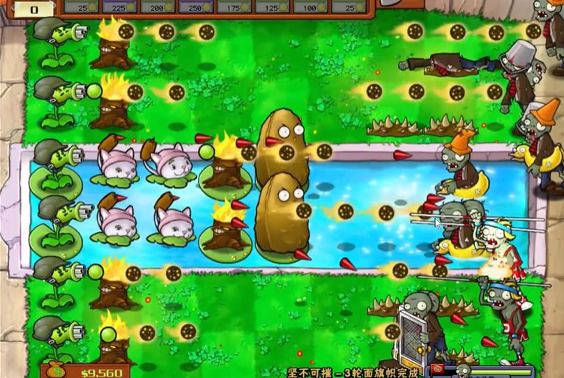 实战过程中保持阵型完整度,每波僵尸进攻结束后,及时修补被啃食的高坚果与南瓜头,无需额外增加输出植物,现有阵容足以应对后续波次强化。面对海豚僵尸、潜水僵尸等特殊单位,水路杨桃与冰瓜减速配合可快速击杀,气球僵尸会被杨桃的全方位弹道拦截,不会出现空中绕后情况。全程无需手动释放技能,依靠固定阵型自动作战,节奏稳定且容错率高,即使面对巨人僵尸投掷小鬼,也能被范围火力快速清理。