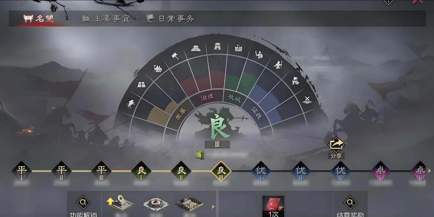 地图上原有的城池外围区域能提供远超普通野地的经验值,虽然难度较高但性价比突出。20-30级阶段可以尝试3级城皮,30级以上再挑战4级城皮。注意观察主城附近随机刷新的经验书,声望达到3000后就有机会遇到,派遣需要升级的武将直接领取即可,无需战斗但会消耗体力。