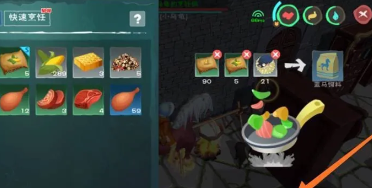 材料备齐后,需放置烹饪锅进行合成。将小麦饲料包、玉米饲料包与河豚依次放入烹饪锅界面,点击开始烹饪即可自动生成蓝马饲料。需注意烹饪锅必须放置于安全区域,避免制作过程被敌对生物干扰。若材料比例错误或未使用饲料包,会导致烹饪失败,河豚等稀有材料将浪费。