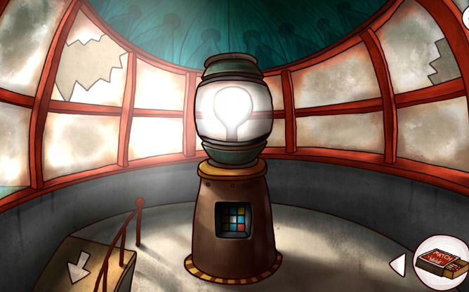 拿到三角形钥匙后记得去一楼开箱子,拉下电闸让二楼的风扇停下来。这时候就能拿到风扇后面的摇杆道具,这个在后面会派上大用场。二楼还会遇到个要空瓶子的小男孩,给他后会得到一个漂流瓶,这其实是前作剧情的延续。灯塔里还有个拼图块别忘了拿,后面解谜要用到。