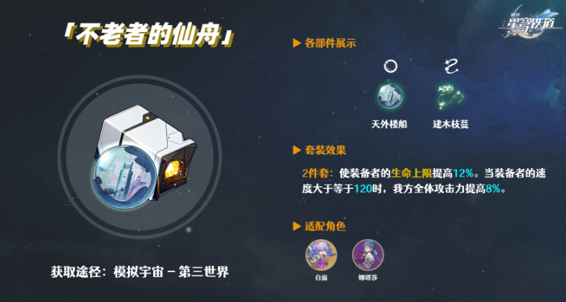 遗器选择上,优先考虑提升攻击力与治疗效率的组合。四件套云无留迹的过客能提高治疗量并开局提供战技点,是毕业首选;两件套不老者的仙舟在速度达标后为全队增加攻击力。过渡期可使用野穗伴行的快枪手与太空封印站的2+2组合。主词条推荐攻击衣、速度鞋、攻击球及充能绳,副词条优先攻击百分比与速度。光锥方面,专属光锥棺的回响提供攻击加成与全队加速,下位替代可选同一种心情或等价交换。