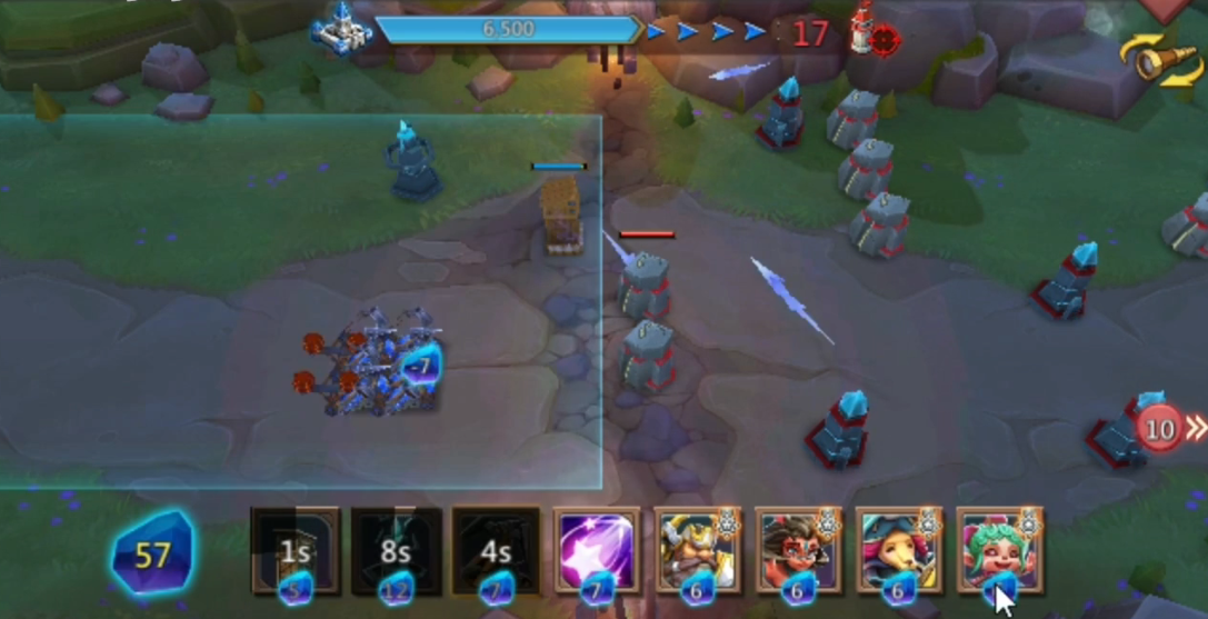 先在后方布置魔像塔和雷电塔建立防线,等敌方第一波攻势被化解再慢慢向前铺场。炮车是拆塔主力但特别脆皮,一定要用防御塔围住它们,看到敌方英雄露头就立刻丢图腾咬住。旋风术的释放时机很重要,最好等3-4座敌方炮塔进入范围再使用,法力值紧张时优先保证炮车存活。如果遇到敌方集火的情况,及时补个治愈者英雄稳住阵脚。