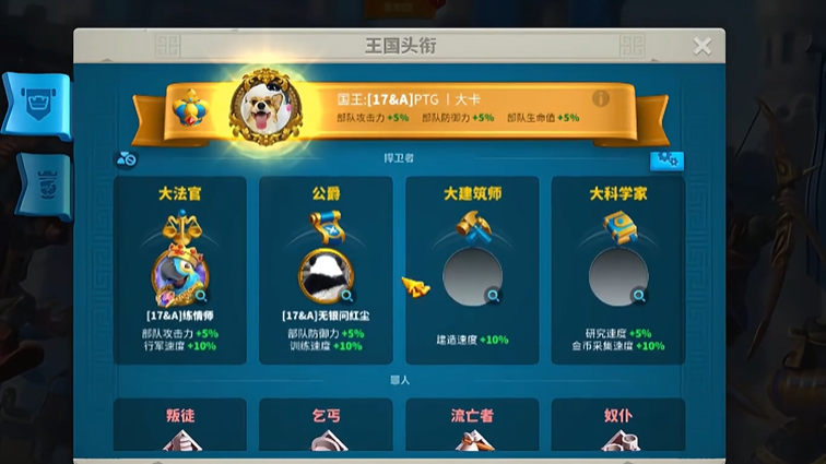 除了王后头衔,其他头衔也有独特作用。元帅能提升部队攻击5%和训练速度10%,适合喜欢打架或爆兵的玩家。大科学家头衔则能加快研究速度5%和金币采集速度10%,对科技流玩家很友好。罪人头衔比如叛徒或乞丐会带来负面效果,比如降低资源产量或部队属性,所以尽量避开这些头衔。头衔的分配权在国王手里,平时多参与联盟活动,贡献高的玩家更容易拿到好头衔。
