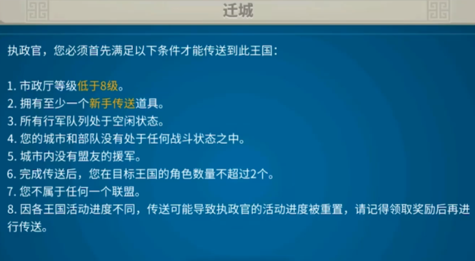 所有部队和武将都得召回主城,斥候也不能在城外溜达。满足这些条件后,点击左下角的城外按钮,缩小地图直到右下角出现地球图标,选择想去的王国和具体区域就能迁城了。如果迁城后不在联盟地盘,记得再用一次新手迁城道具调整位置。