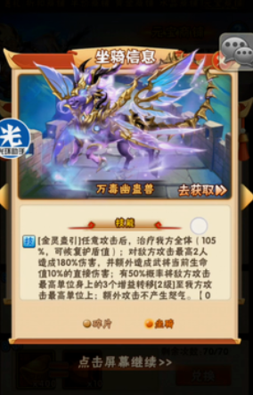 万毒幽蛊兽的治疗和增益转移效果适合辅助位,能显著提升团队续航;黑金墨龙驹的群体伤害适合清理残局;彩金豹的全体输出和控制解除则能改变战场节奏。这些特殊技能要根据武将定位和队伍需求灵活选择,比如控制型阵容优先考虑效果命中属性,爆发阵容则需要先攻和暴伤组合。