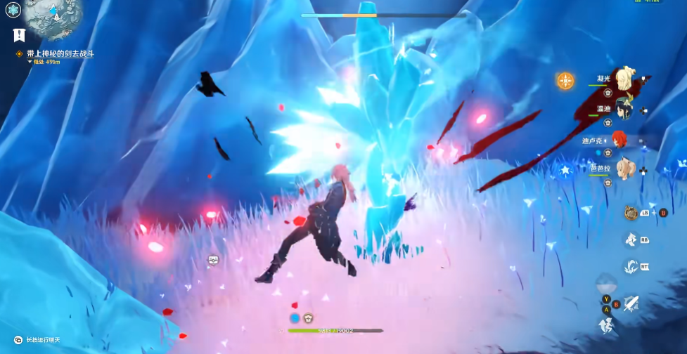 峰顶区域的核心是修复后的寒天之钉,这是一根巨大的冰柱,周围环绕着解冻后的三块碎片。玩家需要再次使用深赤之石攻击这些碎片,每块只需攻击一次即可激活。激活后寒天之钉会完全升起,可以解锁山顶的圣遗物副本芬德尼尔之顶,这是雪山地区重要的装备获取地点。