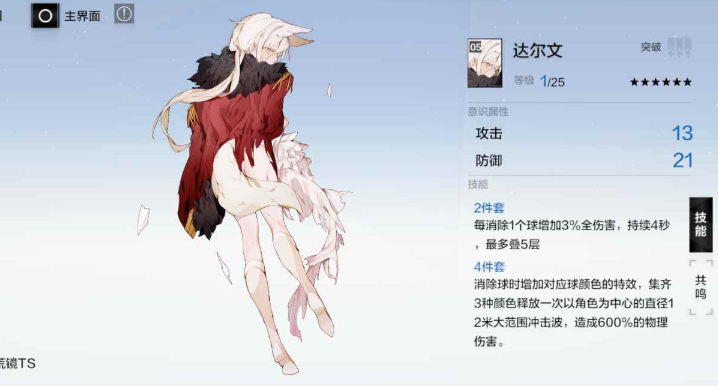 极昼的意识配置推荐采用4伊丽莎白+2达尔文的组合。伊丽莎白套装提供攻击力与火属性伤害加成,四件套效果能触发全队三消额外伤害与生命回复;达尔文两件套则增强信号球消除伤害,强化极昼的输出循环。武器共鸣优先选择提升火伤与核心被动的词条,确保极昼在增幅队友的同时保持自身输出能力。需注意极昼的SSS阶解锁完整机制后,输出能力将达到T0水准。