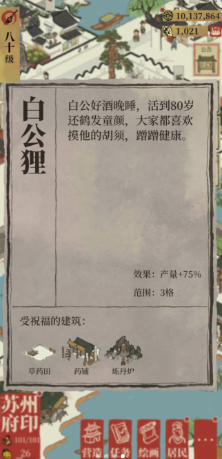 除了玩家自行建造的普通药铺,游戏内还存在一个特殊的动态建筑保安堂药铺,其获取方式完全不同。保安堂药铺无法通过营造菜单建造,而是需要玩家完成杭州府相关的限时探险剧情明察暗访辨真伪才能获得。玩家需要先进入对应的活动地图,通过每日与居民对话收集线索,并通过侦查收缴获取铅银袋子等任务道具。在集齐所需证物并完成后续的清理迷雾、押送家丁、采集毒人参等一系列剧情任务后,即可最终获得保安堂药铺。该建筑放置于城中后,可每小时自动生产30份草药,提供稳定的资源补给。