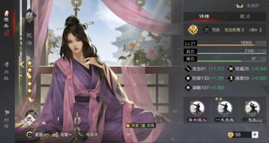皇甫嵩在中军定位时可兼顾控制与辅助输出,携带浑水摸鱼提供群体强控,限制敌方输出节奏,搭配反计之策削减敌方主动战法伤害,提升队伍整体生存,也可选择焰焚箕轸、楚歌四起等主动策略战法,利用高防御属性稳定站场释放输出,适合搭配汉阵营武将激活阵营加成,配合卢植、朱儁组成末路尽忠体系,依托群体属性增益与控制链压制对手,此搭配无需依赖高红度,白板即可稳定发挥,适合平民玩家组建过渡队伍,战法等级拉满后可有效应对多数野外要塞与玩家守军。