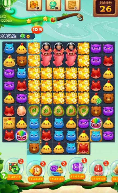 步数分配要精准规划,28步十分紧张,前8步专注破除中间核心雪块,打开全局布局,同时尝试合成第一个特效;中间12步是核心阶段,借助移动地板的位置优势,一边孵化小鸡一边制造特效组合,优先消除底部顽固雪块,同时收集过半小鸡;最后8步进入收尾,集中用魔力鸟加爆炸特效的组合,清理剩余雪块与零散小鸡。不要浪费步数在单一动物消除上,每一步都要兼顾雪块消除与小鸡收集,当地板移动时,优先选择能同时触发两种目标的消除位置,利用连锁反应带动更多区域消除。若剩余步数不足且目标未完成,可合理使用小木锤破除角落死角雪块,或用魔法棒快速生成特效,避免因小障碍卡关。