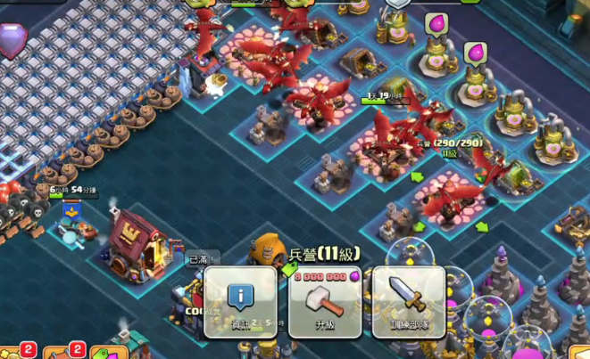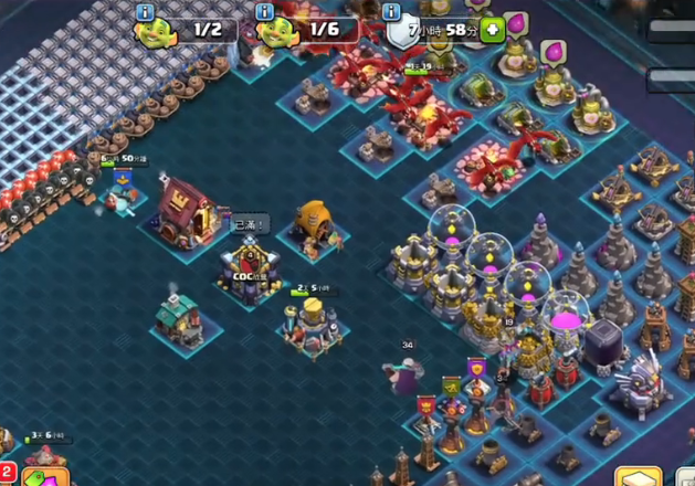 大本营的保护需分场景调整,日常发育打资源时可外置诱敌,被摧毁后获取护盾保护核心资源,部落战与联赛阶段则必须内置核心区,与黑油罐、部落城堡形成防护三角,防止被敌方天女、矿猪等流派快速爆本拿星。核心防御建筑的保护直接决定防守强度,防空火箭需呈三角形分散摆放,避免被闪电法术连锁摧毁,同时全覆盖村庄空域,克制雷龙、狗球等主流空军;地狱塔、天鹰火炮、投石炮等重型防御要均匀分布在阵型各区域,形成交叉火力网,避免集中被敌方冰冻或法术摧毁,单体地狱塔针对皮卡、石头人等高血量单位,多目标地狱塔克制野蛮人、弓箭手等人海部队。