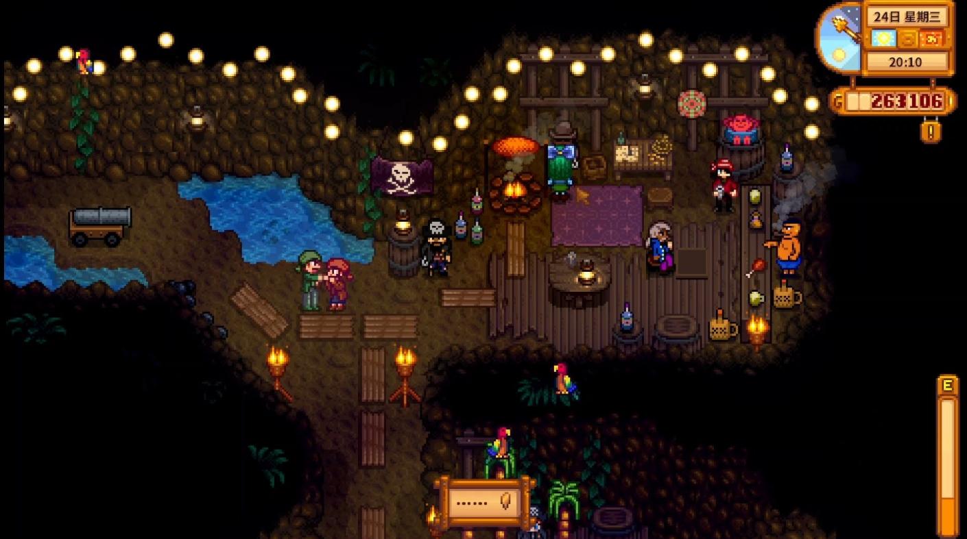解锁海盗湾的前提是修复度假村,需向码头旁的鹦鹉支付20个金色核桃。完成修复后,玩家可沿右侧海滩方向行进,在最右侧墙壁处找到一块木板,进入后即可抵达洞穴内的湖泊。该区域右下角还藏有一颗可挖掘的核桃,建议在探索时一并收集。