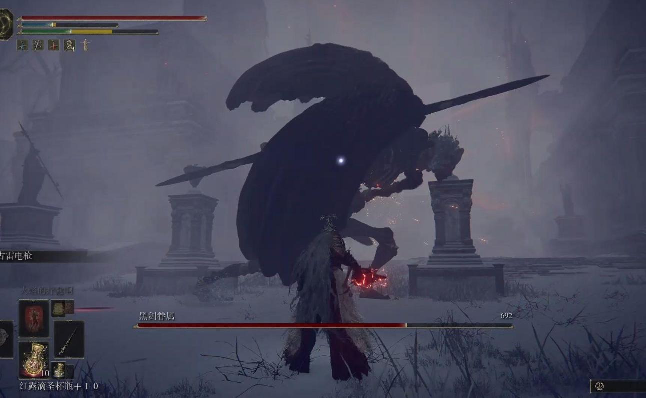 禁域的整体设计为长条形,玩家需沿固定路线前进,途中会经过小黄金树标志性地点。尽管地图能见度低,但路径相对明确,只需避免因雾气干扰而偏离主干道。中段会遇到黑剑眷属敌人,建议绕行而非纠缠,直接进入后方建筑物即可完成区域探索。这种设计体现了游戏对环境叙事与玩家自主探索的平衡,浓雾既是挑战也是引导手段。