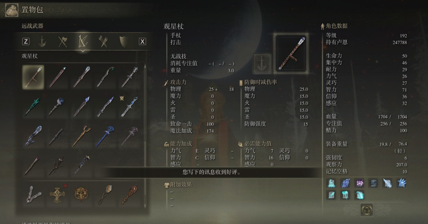 法杖是释放魔法的必备工具,没有它,再强的魔法也无法施展。打开装备菜单,在武器栏选择一把法杖装备上。如果还没有法杖,可以去宁姆格福的驿站街遗迹地下室找瑟濂,她不仅会卖魔法,还会提供基础法杖。装备好法杖后,记得在任意赐福点休息时点击回忆选项,把想用的辉石魔法装备到法术栏里。