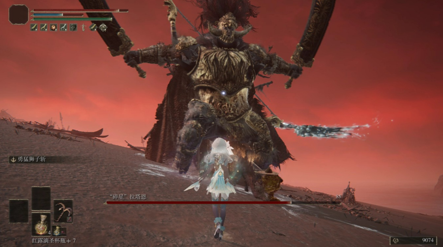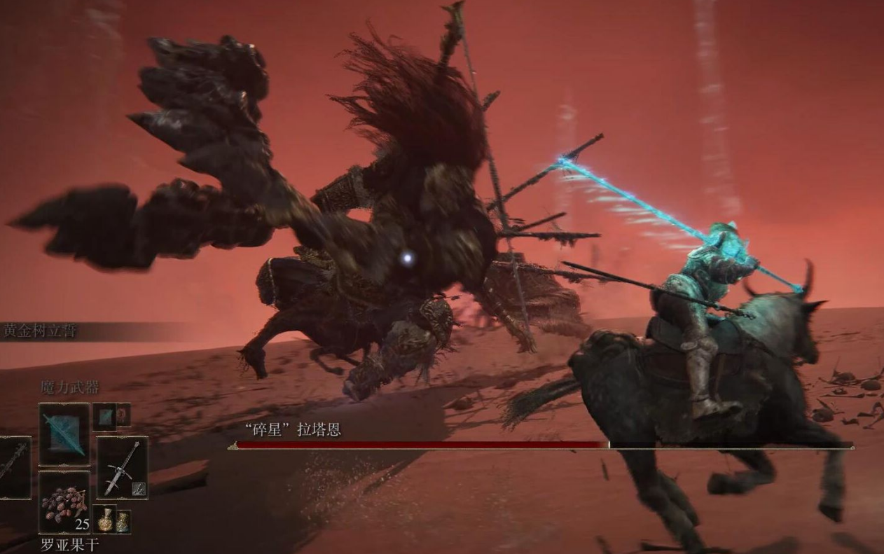 碎星的招式非常多,一阶段主要是弓箭和双刀连砍,二阶段会飞天放陨石和闪电旋风劈。看到他蓄力放技能时,一定要提前翻滚或骑马拉开距离。近战的话尽量钻到他的胯下输出,那里算是安全区。如果觉得太难,可以试试冻霜踏地这个战技,范围大伤害高,对碎星这种体型大的BOSS特别有效。