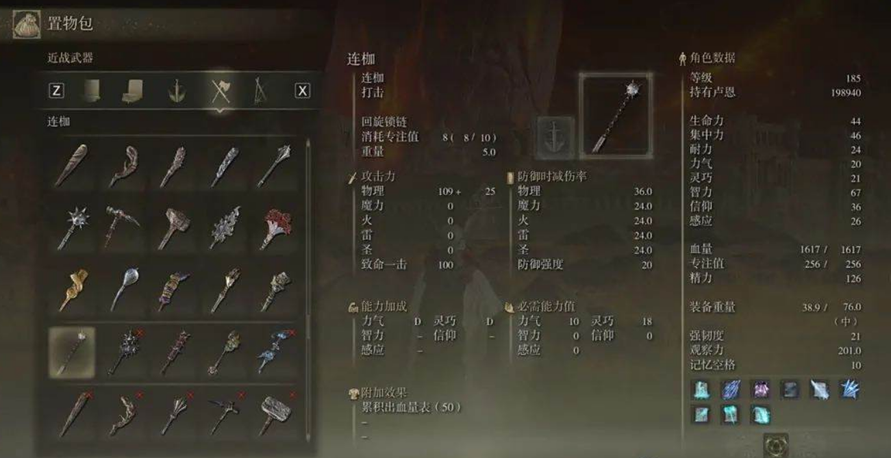 链枷的强化路线可以根据战技需求选择。如果喜欢回旋锁链,可以优先提升力量属性;家人头连枷和弃子的繁星则需要智力加成。链枷的出血效果对部分BOSS效果显著,但面对免疫出血的敌人时建议切换其他武器。链枷的模组整体偏慢,建议搭配一些快速武器作为副手,弥补灵活性不足的问题。