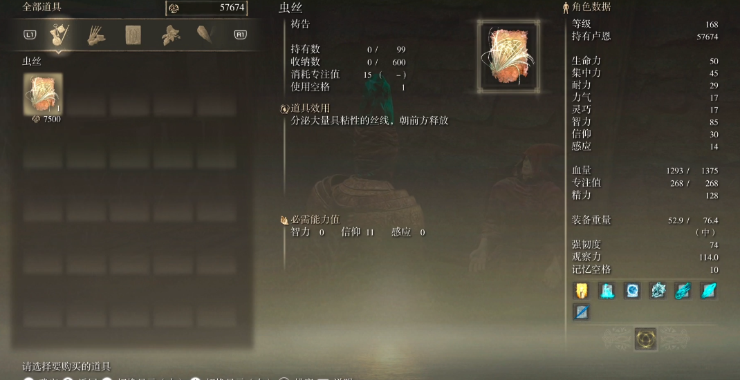 虫丝的实战技巧在于灵活运用它的控制效果。它的丝线能短暂阻碍敌人行动,为你争取喝药或调整站位的时间。面对多个敌人时,可以先手用虫丝限制它们的移动,再逐个击破。如果遇到高机动性的敌人,虫丝的蓄力释放可能不太实用,这时快速轻按祷告键打出一发普通虫丝会更安全。