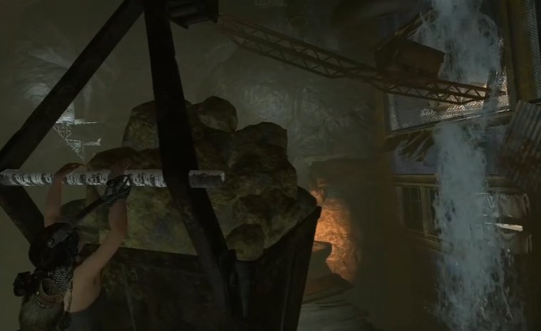 从小平台起跳到对面长平台,从长平台左边上去。这里有个隐秘的拉绳,用弓箭射击拉绳可以把小矿车推出来。回到长平台,把刚才放出来的小矿车用绳索连接到附近的绳柱上。这一步需要确保矿车位置对准水流方向,否则后续操作会失败。