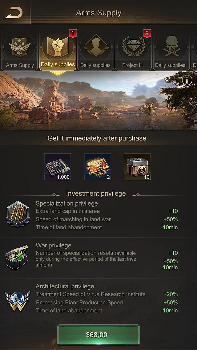荣誉加成卡是投资优先级最高的硬通货,仅能通过废土投资与活动获取,使用后可让占领土地、升级荣誉建筑获得的荣誉值翻倍,是快速提升专精等级的关键,务必在资源充裕时优先囤购,避免后期因荣誉增长缓慢拖累整体进度。复合礼包的性价比同样突出,每周的68元档位值得入手,重点留存礼包内的复合材料兑换卡,切勿提前使用,赛季结束前妥善保管可确保资源不被回收。荣誉勋章为跨赛季通用资产,不会随赛季更迭失效,前期积累、后期使用的策略能让开局即占优势,配合专精加点可实现战力与资源效率的双重跃升。